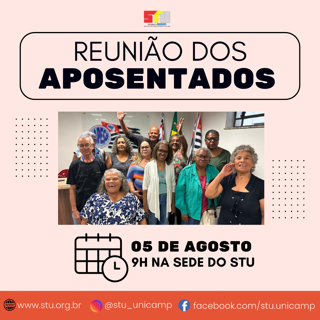 A Coordenação de Aposentados e Assuntos de Aposentadoria do STU convida todos aposentados da Unicamp para participarem da tradicional reunião dos aposentados que acontece toda terça-feira, a partir das 9h, na sede do STU.