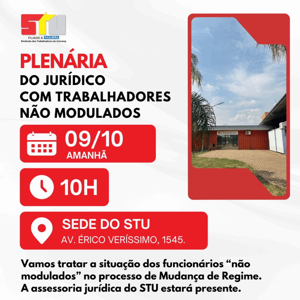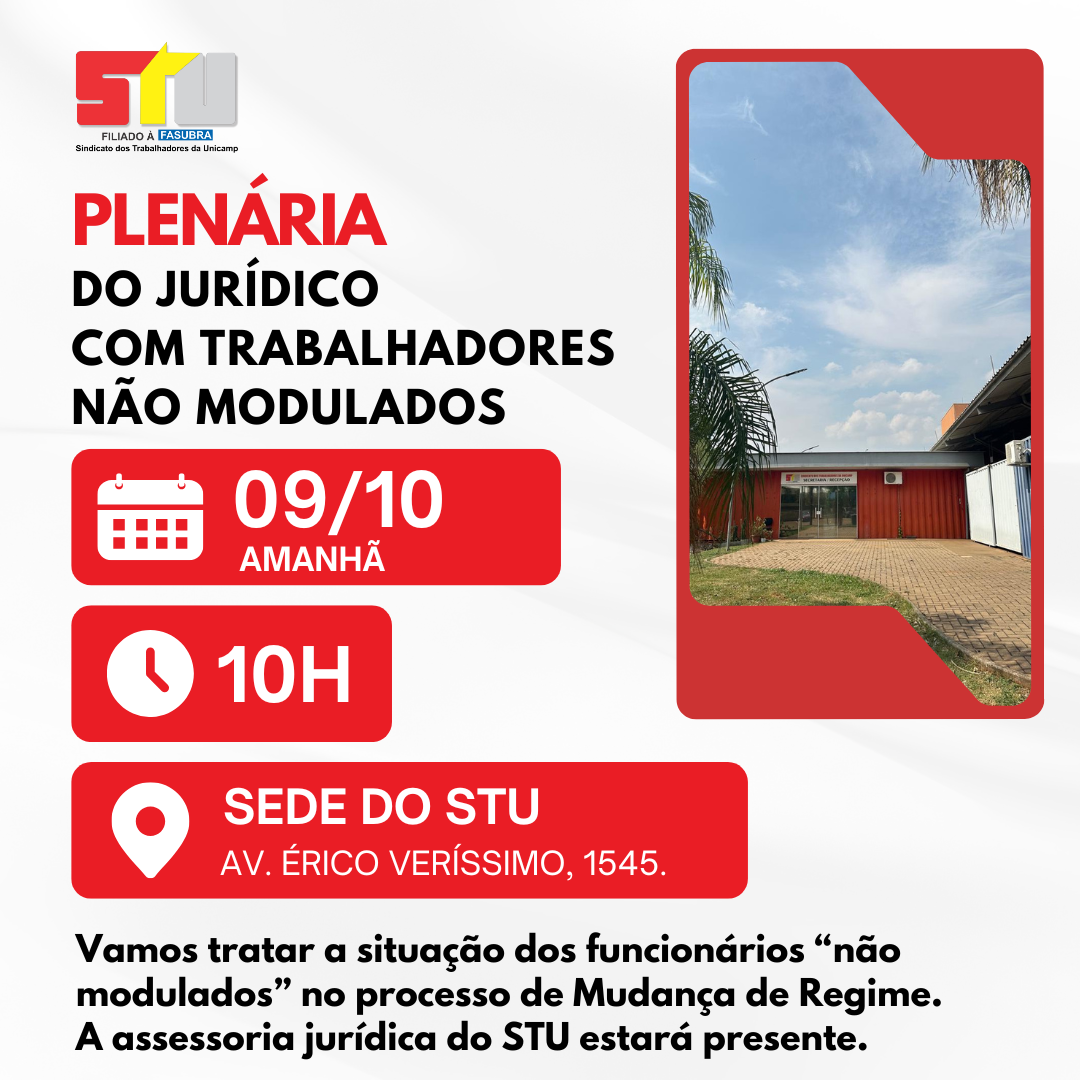 Nesta quinta, 09/10, às 10h, vai acontecer mais uma Plenária do Jurídico na sede do STU para tratar a situação dos funcionários “não modulados” no processo de Mudança de Regime.