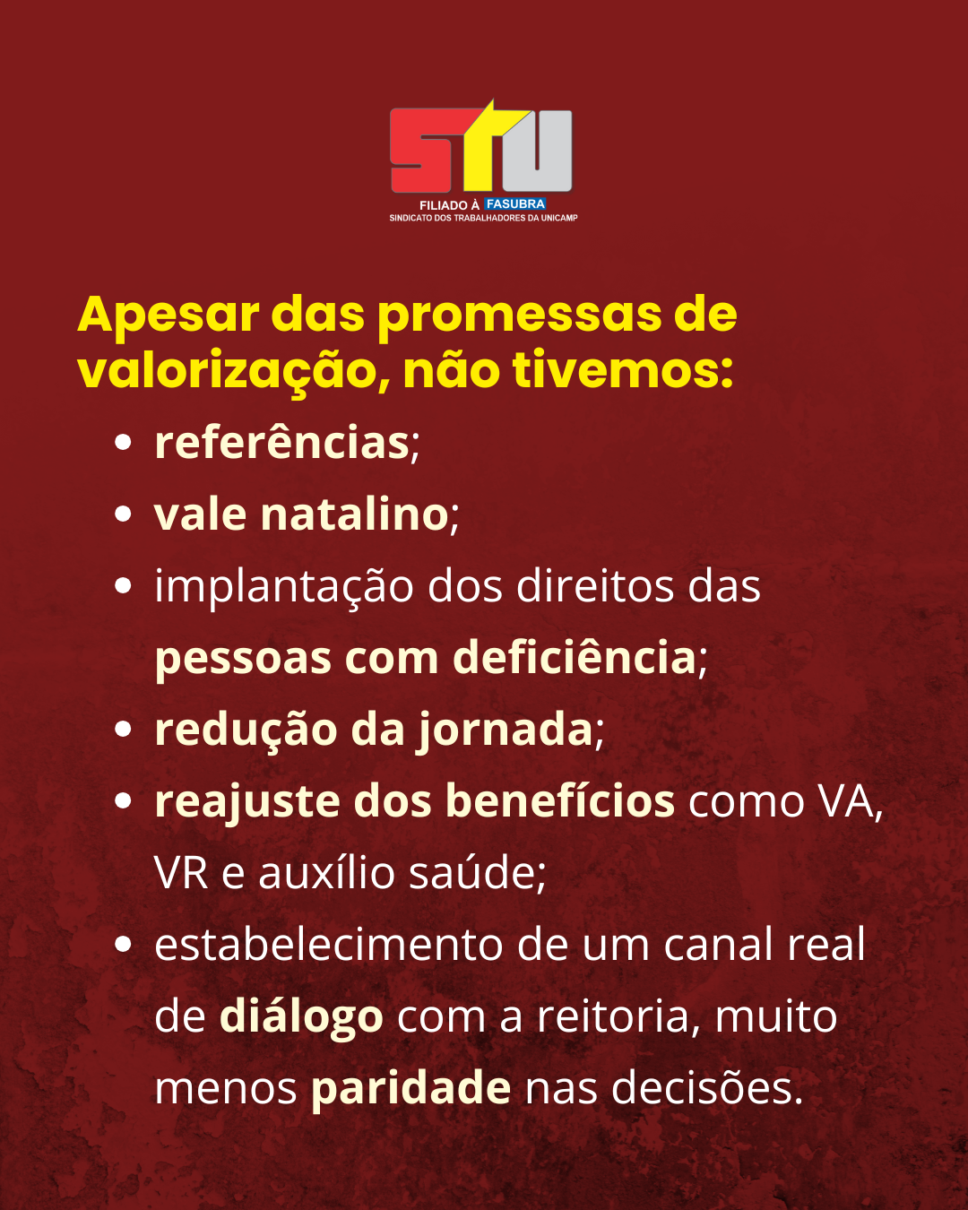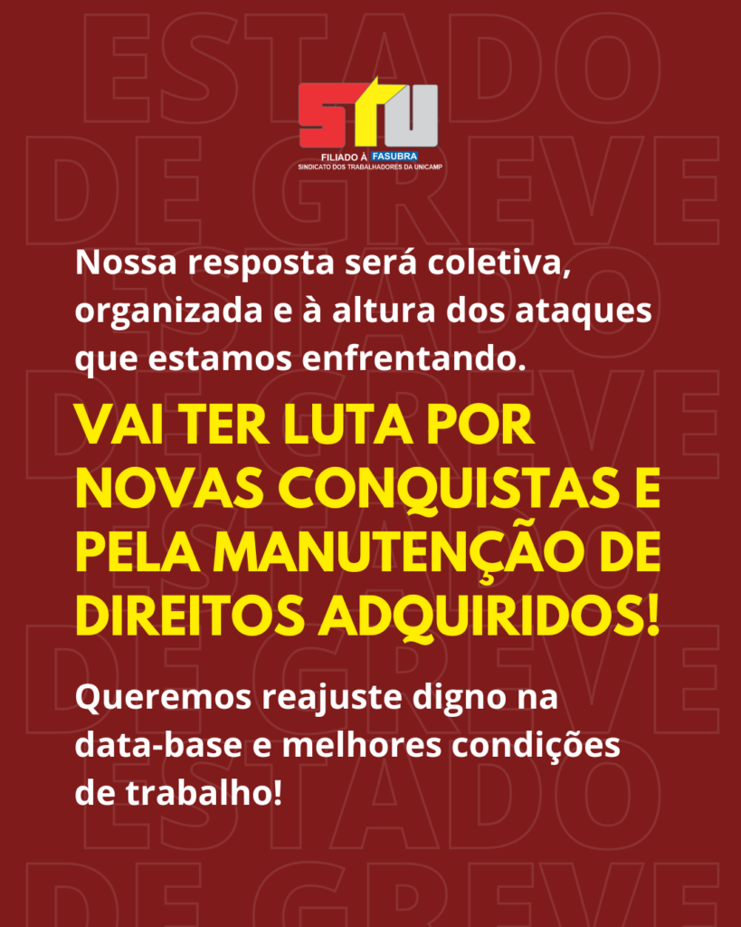 Dias atrás vocês comentaram no Boletim quanto a data base….fez lembrar_me do infeliz congelamento que Reitoria virou em nada quanto promessa política permanente, e assim ficou congelada esta situação perdas 2023… E Tão Admiro a força base Sindical STU e lembro que lutaram por ressarcimento das perdas 2023 e assim entendo que foram fatos legítimos embasados no desfalque salárial do trabalho e assim desperta_me e lhes pergunto!! Vocês STU e até outras universidades!! irao retomar esta luta tão legitima e embasada a buscar oque pertence ao construtor trabalhador!? Ou esperam que crise orçamentaria irá passar!? Sabe! STU! Esta crise tem tendência a piorar, Então!! que seja Nos trabalhadores e bases sindicais a buscar no mínimo perdas 2023 em parcelamento em calendário, sendo igual temReitoria/DGRH tem feito calendário quinquênio….A Reitoria sabe que funciona a empregado & Patrão sendo a política parcelada e paga em calendário! Poderiam fazer negociação rssarcimento a nossas perdas salariais…E vamos pensar nesta busca parcelamebto e tão pórquê estando em torno mais que 17% de perdas; e talvez nem data base inflação teremos assim entãio vamos as nossas perdas…que infelizmente nem finalizaram negociaram acordo por resistência da Reitoria… e seja assim!! a insistir a rertomada busca.