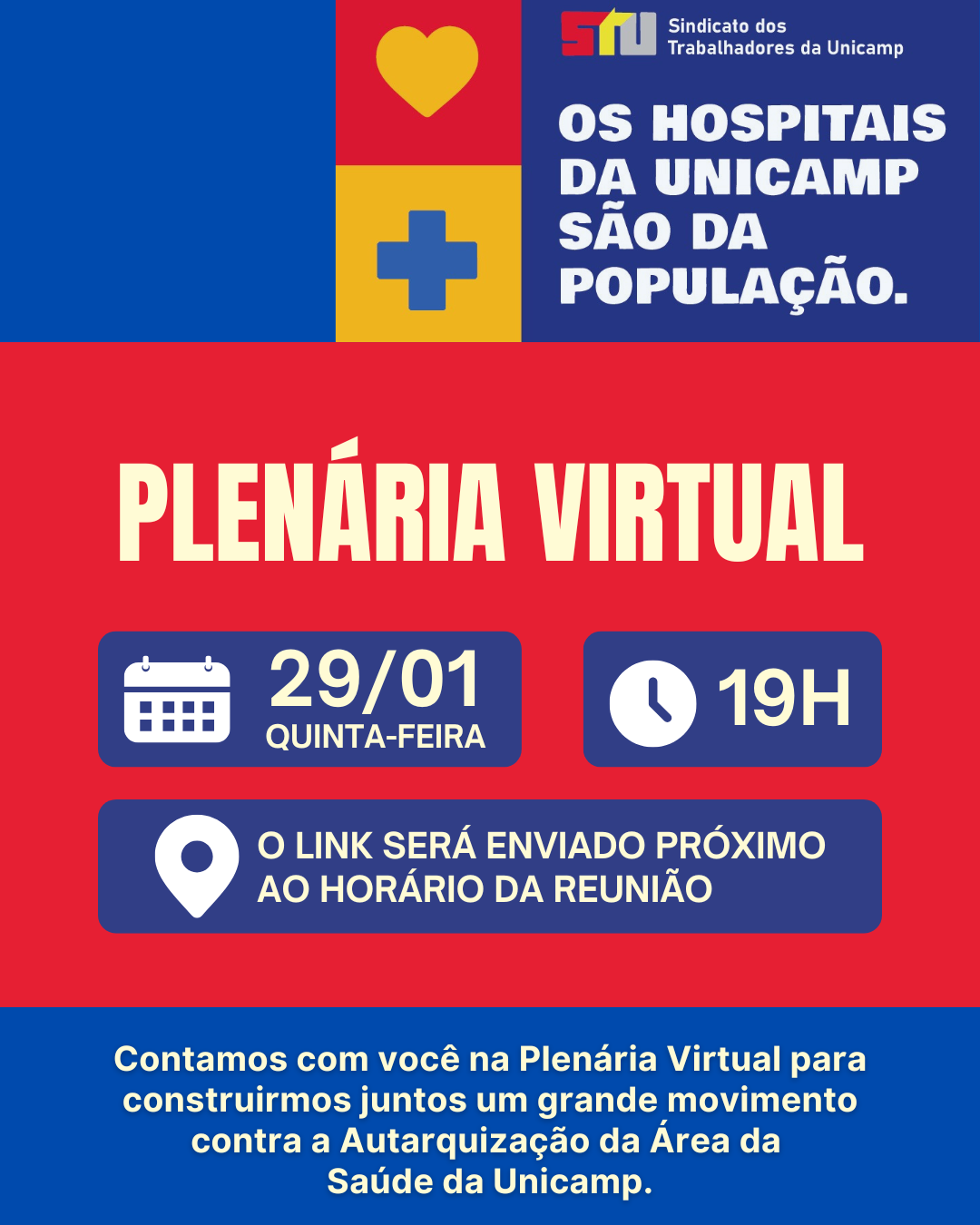 A luta contra a Autarquização da Área da Saúde da Unicamp continua e o STU está convocando mais uma Plenária Virtual, para a próxima quinta-feira, dia 29/01, às 19h, para construirmos juntos um grande movimento!