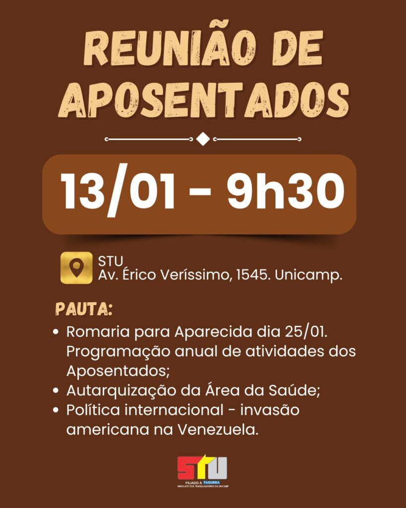 A Coordenação da pasta de Aposentados do STU convida todos e todas aposentadas e pensionistas para participarem da primeira reunião do grupo de 2026, que vai acontecer na sede do STU, na próxima terça-feira, 13/01, às 9h30.
