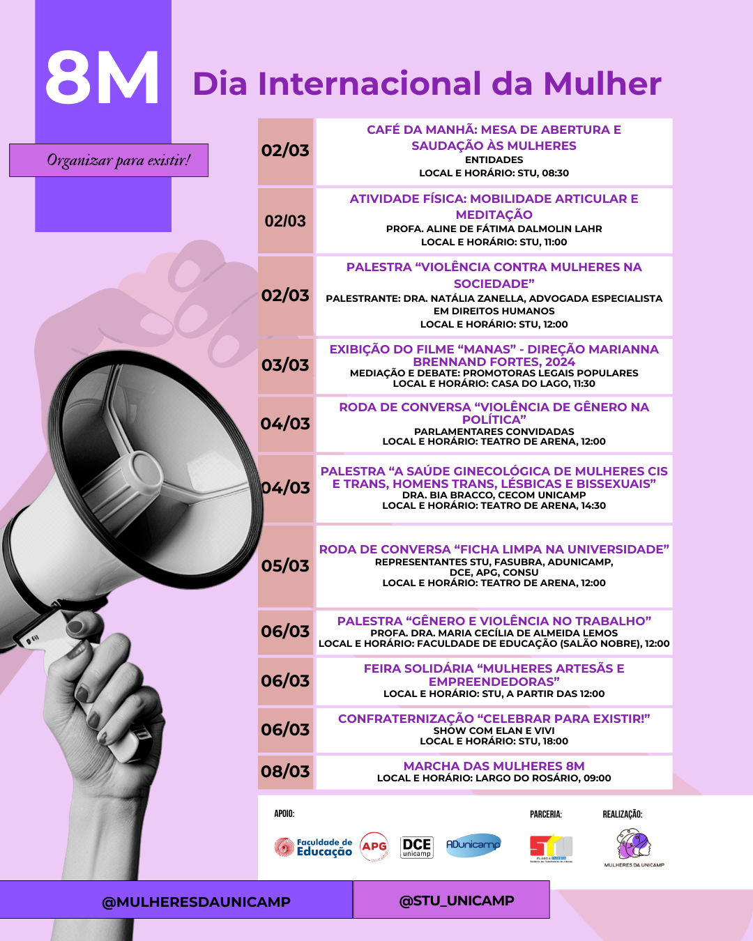 É nesse espírito de luta e organização que vem aí a Semana das Mulheres da Unicamp, em parceria com o Sindicato dos Trabalhadores da Unicamp (STU). A programação reúne debates, rodas de conversa, atividades culturais, palestras e o diálogo institucional necessário para avançarmos na construção de uma universidade mais justa e livre de violências.