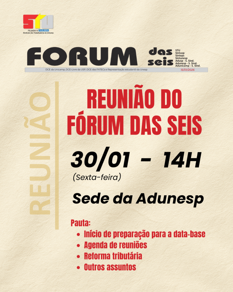 Nesta sexta, 30/01, haverá reunião na Sede da Associação dos Docentes da Unesp (ADUNESP), em São Paulo, para debater estratégias de preparação da data-base 2026, agenda de reuniões do Fórum das Seis, reforma tributária, andamento dos GTs (Permanência e Previdência), entre outros assuntos.