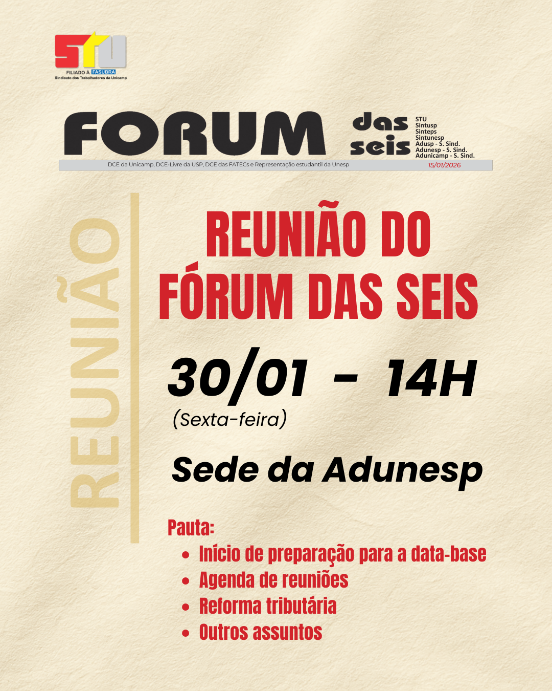O STU está participando ativamente das discussões do Fórum das Seis sobre a nossa data-base e outros assuntos que envolvem as Universidades Estaduais Paulistas.