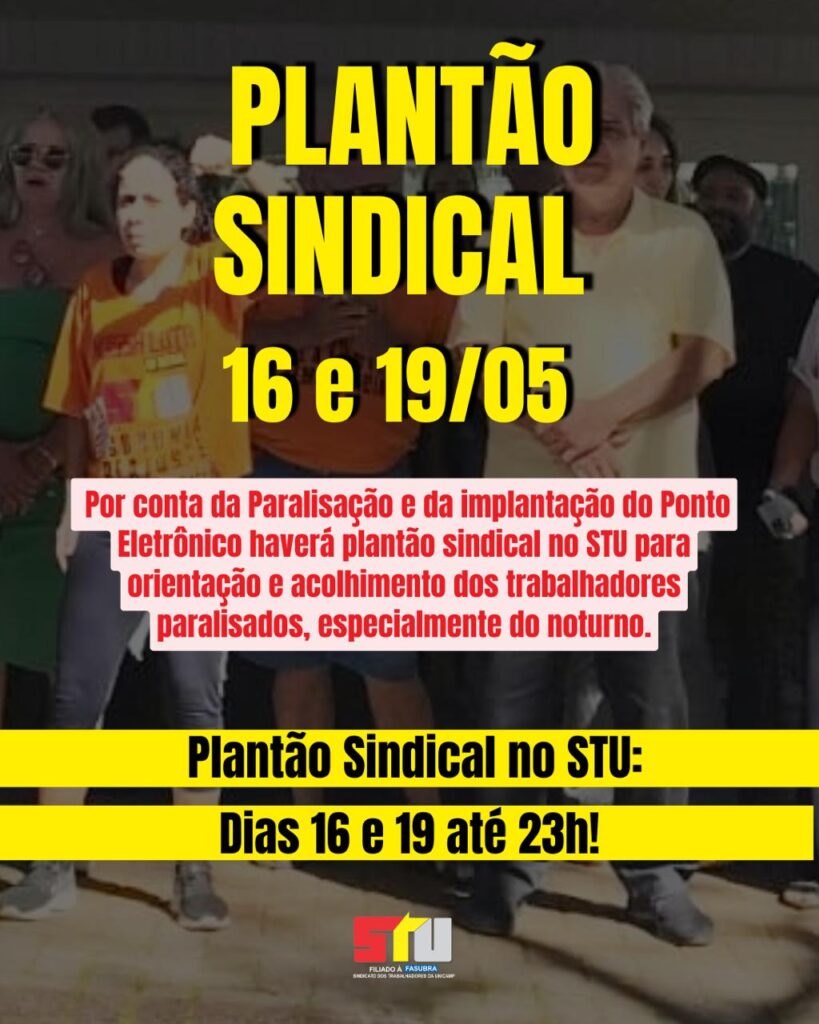 Devido a Paralisação e a implantação do Ponto Eletrônico haverá Plantão Sindical, na sede do STU, para orientação e acolhimento dos trabalhadores que aderiram a paralisação, especialmente do noturno que possam ter algum problema com o registro de ponto.